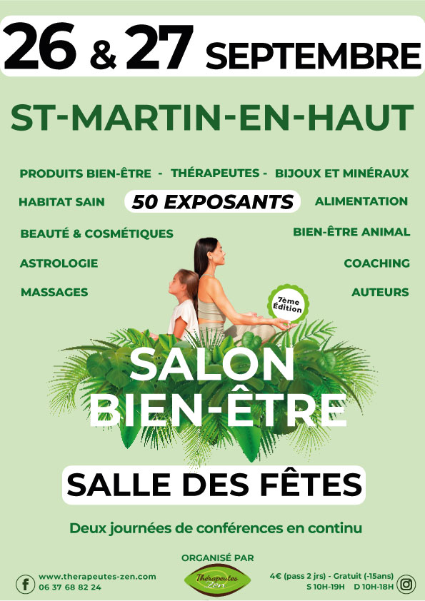 50 exposants à la salle des fêtes , Therapeutes-Zen sera présent les 26 & 27 Septembre 2026 à St Martin-en-Haut pour la 7ème édition.